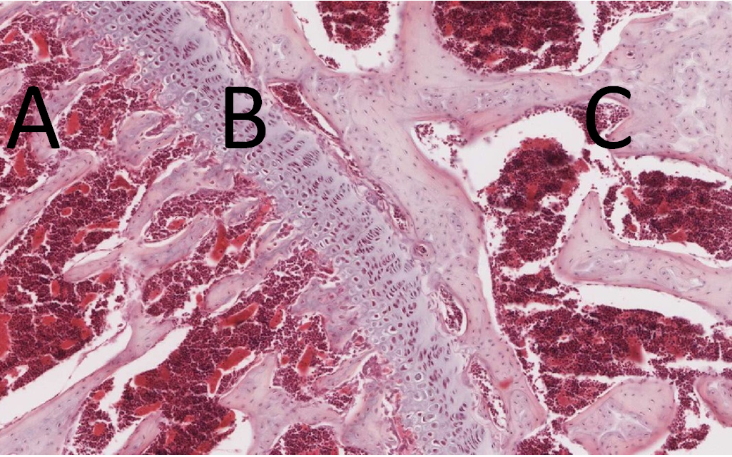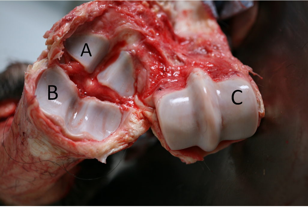 Answer: A=proximal sesamoid bone, B=proximal phalanx, C=metacarpal or metatarsal bone (cannon bone)