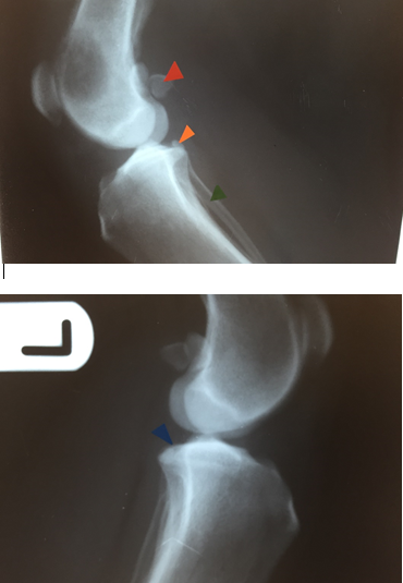 Red = sesamoid bones in gastrocnemeus m. (fabellae)