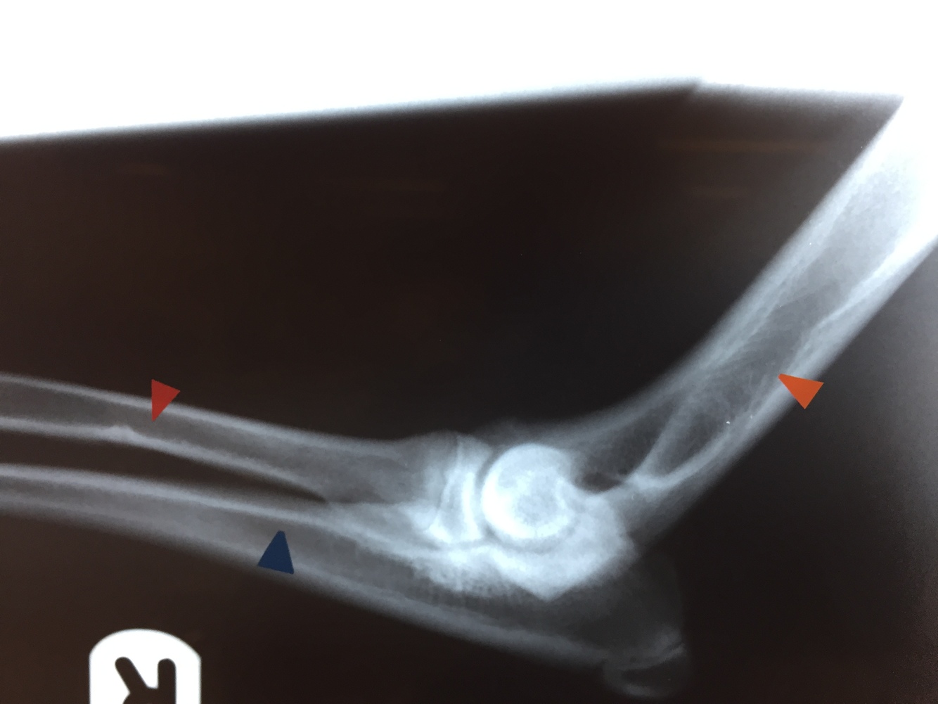 On this radiograph (2/22) identify the labelled structures (red, blue, orange, green).