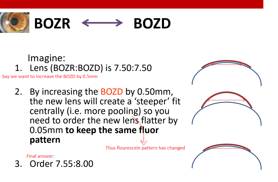 0.5mm change in BOZD needs a 0.05mm change in BOZR to keep the same fluorescein pattern