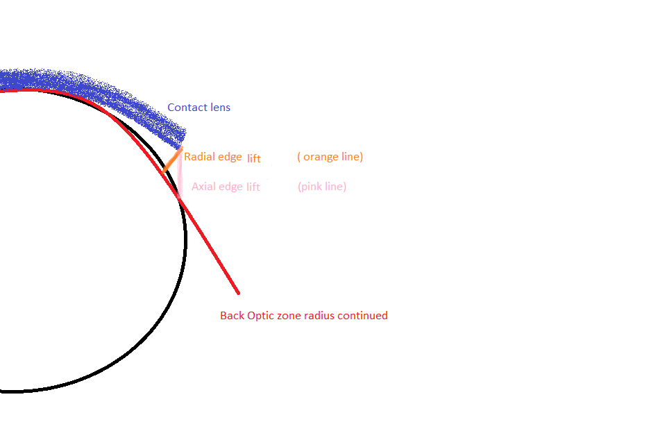 Edge lift is the distance from the tip of the contact lens to where the continuation of the back optic zone radius would be.