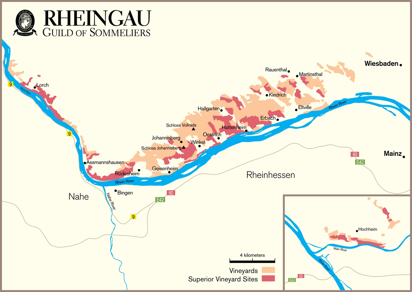 Assmannshausen, Rüdesheim, Geisenheim, Johannisberg, Winkel, Oestrich, Hallgarten, Hattenheim, Erbach, Kiedrich, Hochheim