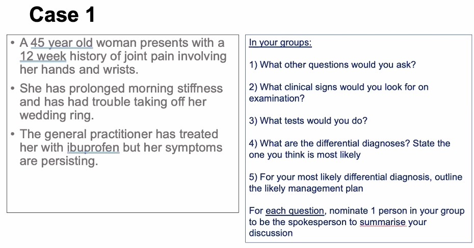 4) Differential diagnosis: Rheumatoid arthritis-as female, prolonged morning stiffness (so definitely not OA-likely inflammatory arthritis), hands and wrist, PIP-as wedding ring (less likely psoriatic arthritis (check for pitting in nails and skin involvement) or fracture or gout (but gout is usually acute so less likely) not likely to be reactive arthritis as that’s more acute too)
