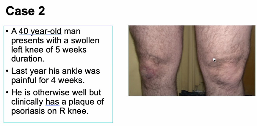 4) Differential diagnosis: Most likely= Psoriatic arthritis (injury), (reactive arthritis-as not many joints involved so could be this, gout can affect large joints but usually affects big toe first so there is a history of this usually)