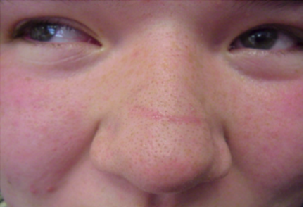 Allergic crease (Indicates repeated itching or rubbing of the nose in allergic rhinitis)