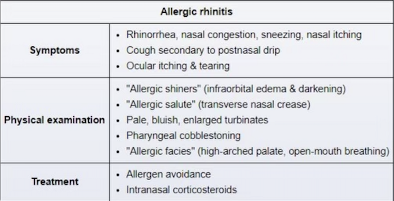 Sneezing, itchy nose, watery eyes, pale or violaceous nasal turbinates, and nasal polyps.