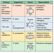 1) R. rickettssi: FEBRE MACULOSA (Morte 50%) 2) R. akari: RIQUETSIOSE VESICULAR 3) R. prowezakki: TIFO EPIDÊMICO 4) R. typhy: TIFO ENDÊMICO