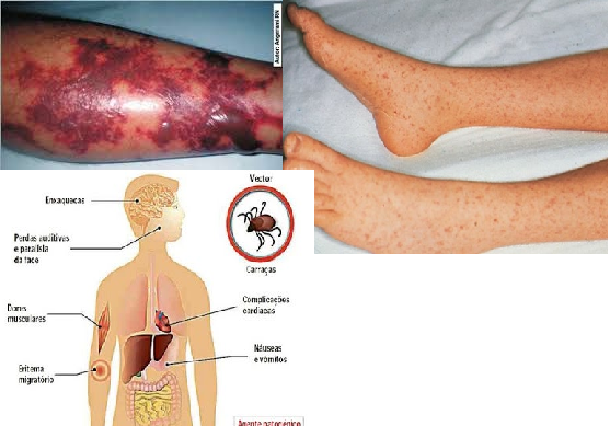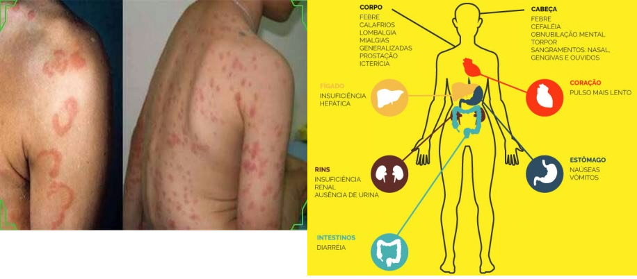 1) 7 dias após picada 2) Febre alta e cefaleia 3) Após 3 dias: erupção cutânea macular nos braços que espalha pelo tronco 4) Pode ter envolvimento neurológico, renal e pulmomar