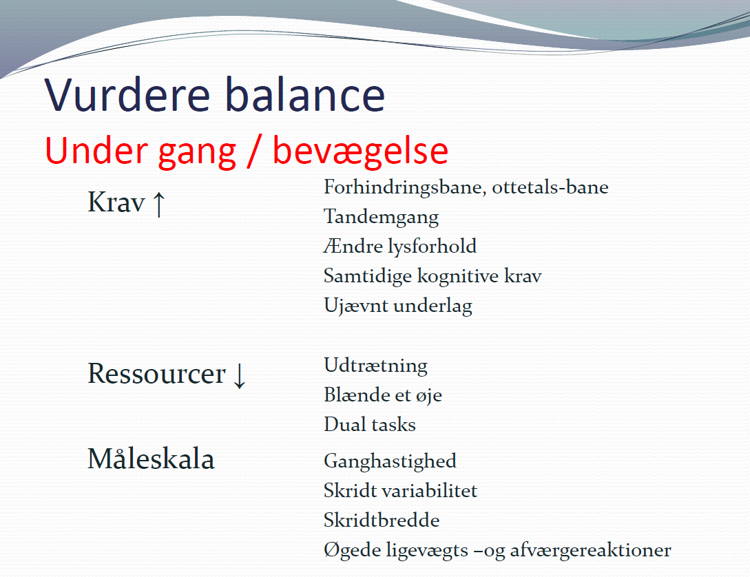Undersøgelser ift. balance ? Vestibulær, Styrke, syn, proprioception, koordination,Holdningsanalyse, Tandem , CtSIB(Syn/proprioception test - lukket øjne og underlag manipulation), Række ud efter noget stående(hvor langt kan armen komme frem - Funktional reach test), Objekt manipulation, Kognitiv task(tælle ned), Push and release ( Re-aktiv test),