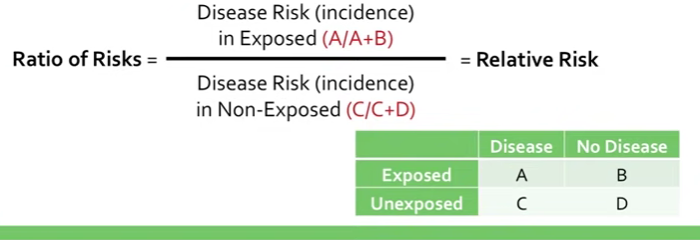 ratio of the probability of an event occurring with an exposure versus the probability of the event occurring without the exposure.