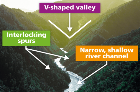 In the upper course of a river, water and the material it carries cut into the river bed, creating a steep-sided V-shaped valley