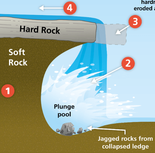 Gorges: As erosion continues, the waterfall retreats upstream, leaving a steep-sided valley downstream. This is known as a gorge