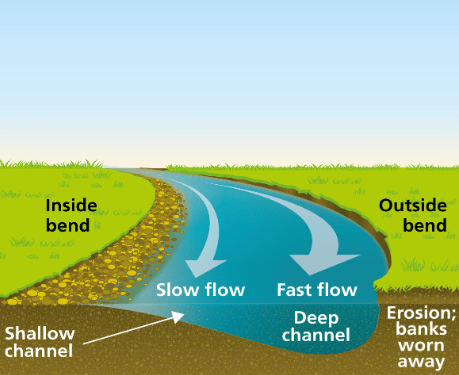 Erosion and Transportation: Erosion and transportation take place on the outside bend, where the river flows fast. The deeper channel creates less friction, which enables the water to flow quickly. Over time, erosion cause the riverbanks to be undercut and worn away, forming river cliffs