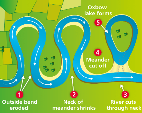 2. The neck of the meander continues to narrow until the river eventually breaks through to form a new river channel