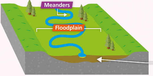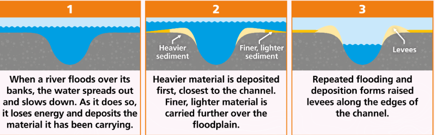 When a river floods, material being carried by the river is deposited on the floodplain. Over time, this raises the height of the floodplain.