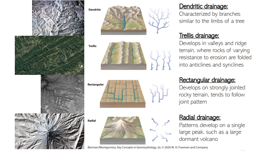 Trellis - develops in linear mountain valleys (product of anticline & syncline folded rock structures - erosivity impacts drainage shape)