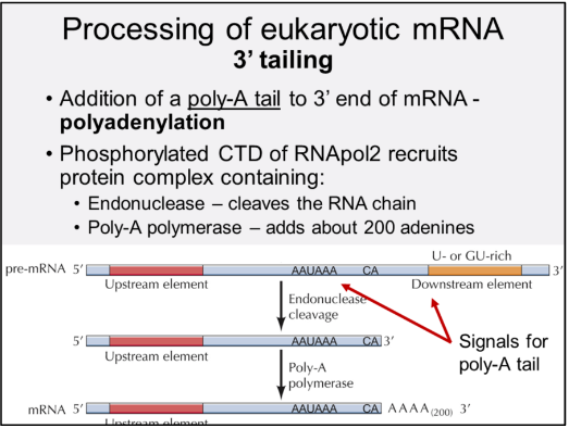 3’ tailing enzymes associate with phosphorylated CTD of RNApol2, and travel with the polymerase all the way from the transcription initiation site AAUAAA is a highly conserved signal sequence in mammalian cells. Lies 10-30 nucleotides upstream of the polyadenylation site