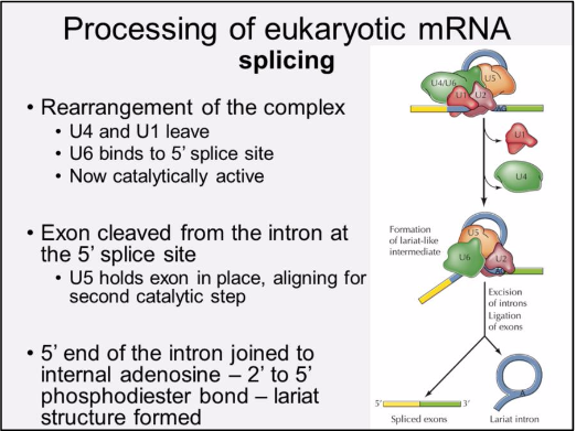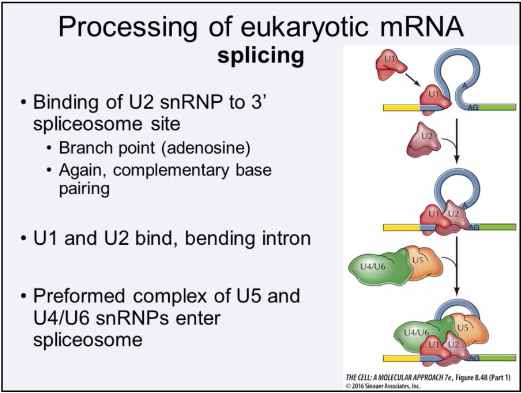Other proteins recognize the 3’ spliceosome site and cause the intron to “bulge.” U5 holds the first exon in place