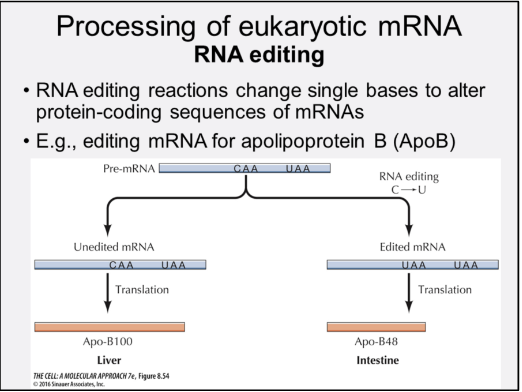 The apolipoprotein B (ApoB) gene is edited to produce two distinct proteins in the liver and the small intestine. ApoB100 (4536aas) is produced in the liver by translation of unedited mRNA. ApoB48 (2152aas) is produced in the intestine from mRNA that a C has been changed to a U by deamination, creating a stop codon (CAA->UAA).