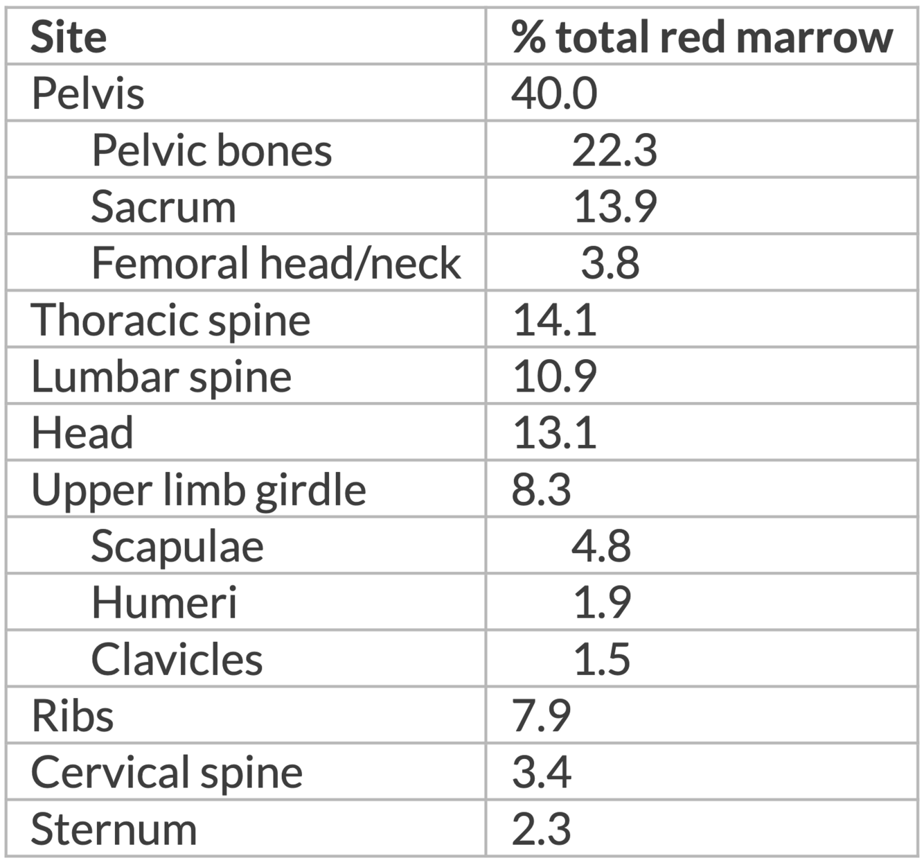 Which sites in an adult human body harbor bone marrow and in what proportions?