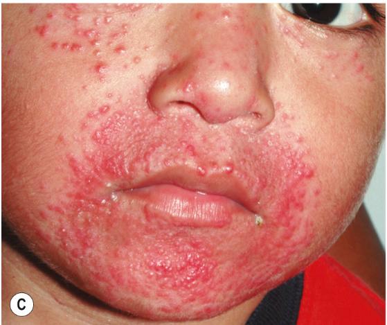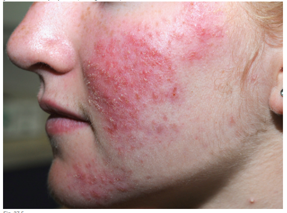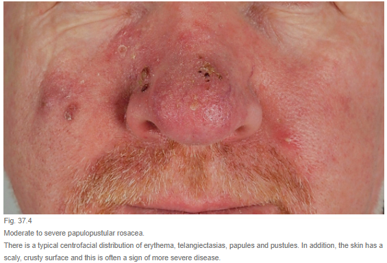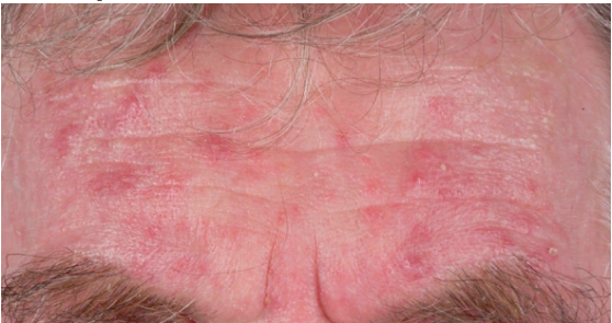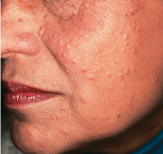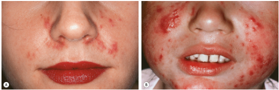 Characterized by centralofacial eruption of multiple, small dome-shaped ,erythematous papules that appear alone or in crops