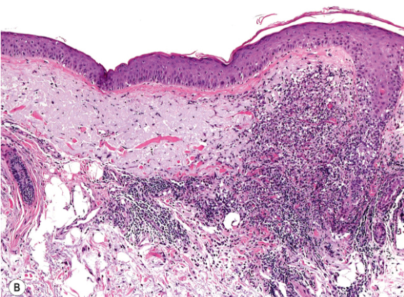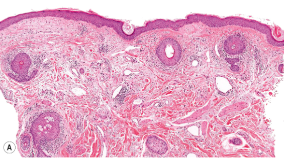dense dermal infiltrate of lymphocytes, predominantly surrounding hair follicle