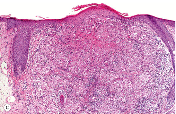 Nodular granulomatous infiltrate composed of histiocytes, histiocytioc giant cells and admixed lymphocytes in upper interfollicular dermis