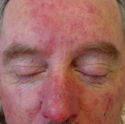 This image is of a patient with rosacea. There is evidence of widespread erythema over the nose, cheeks and forehead - commonly affected area in rosacea. There is evidence of flushing which is often the first symptom seen in patients affected with this condition, as well as visible papules and pustules on her forehead. There are potentially early stages of rhinophyma and no evident ocular involvement.