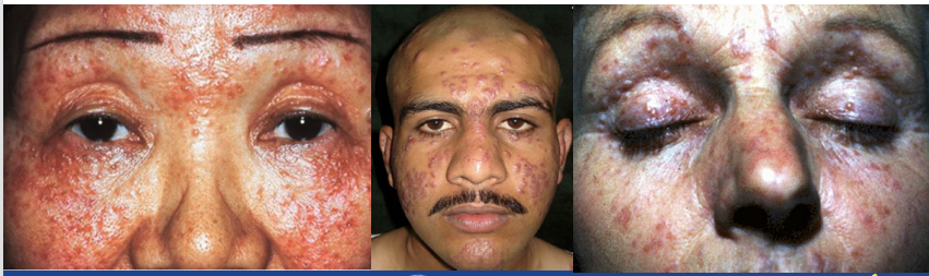 Granulomatous rosacea: discrete yellow/brown-red firm monomorphic papules or nodules on background of diffusely reddened thickened skin no butterfly region. Can also be distributed around periphery of face and perioral areas. On histology, non-caseating epithelioid granulomas; resembles sarcoidosis.