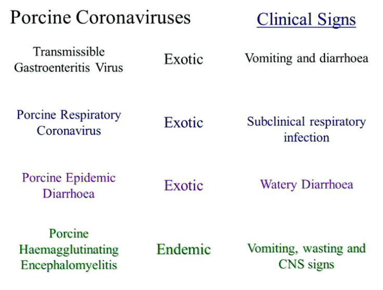 Porcine Epidemic Diarrhoea- massive US outbreak recently- watery dirrahoea