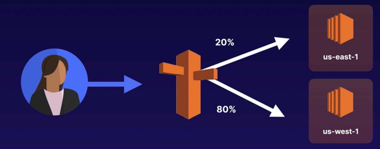 Allows you to split your traffic based on different weights assigned (e.g. set 10% of your traffic to go to us-east-1 and 90% to eu-west-1).