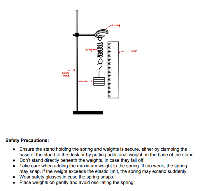 attach [pomter to base of spring, ensuring that it is parallel to the wrokbench, and perpendicular to the metre ruler - align the top of the ruler with top of the spring