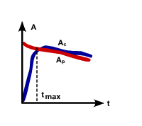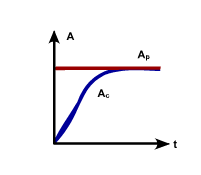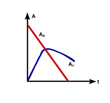 The first situation applies when Tp is so long (“almost infinite”) that the decay of the parent is negligible. The parent activity Ap shown by the red line almost does not change with time whereas the child activity shown by the blue line increases initially and after about five child half-lives, it equals the parent activity, Ac = Ap. When this occurs, the parent and child are in secular equilibrium. An example is 226Ra (Tp = 1620 y) → 222Rn (Tc = 4.8 d) → … → 210Pb.