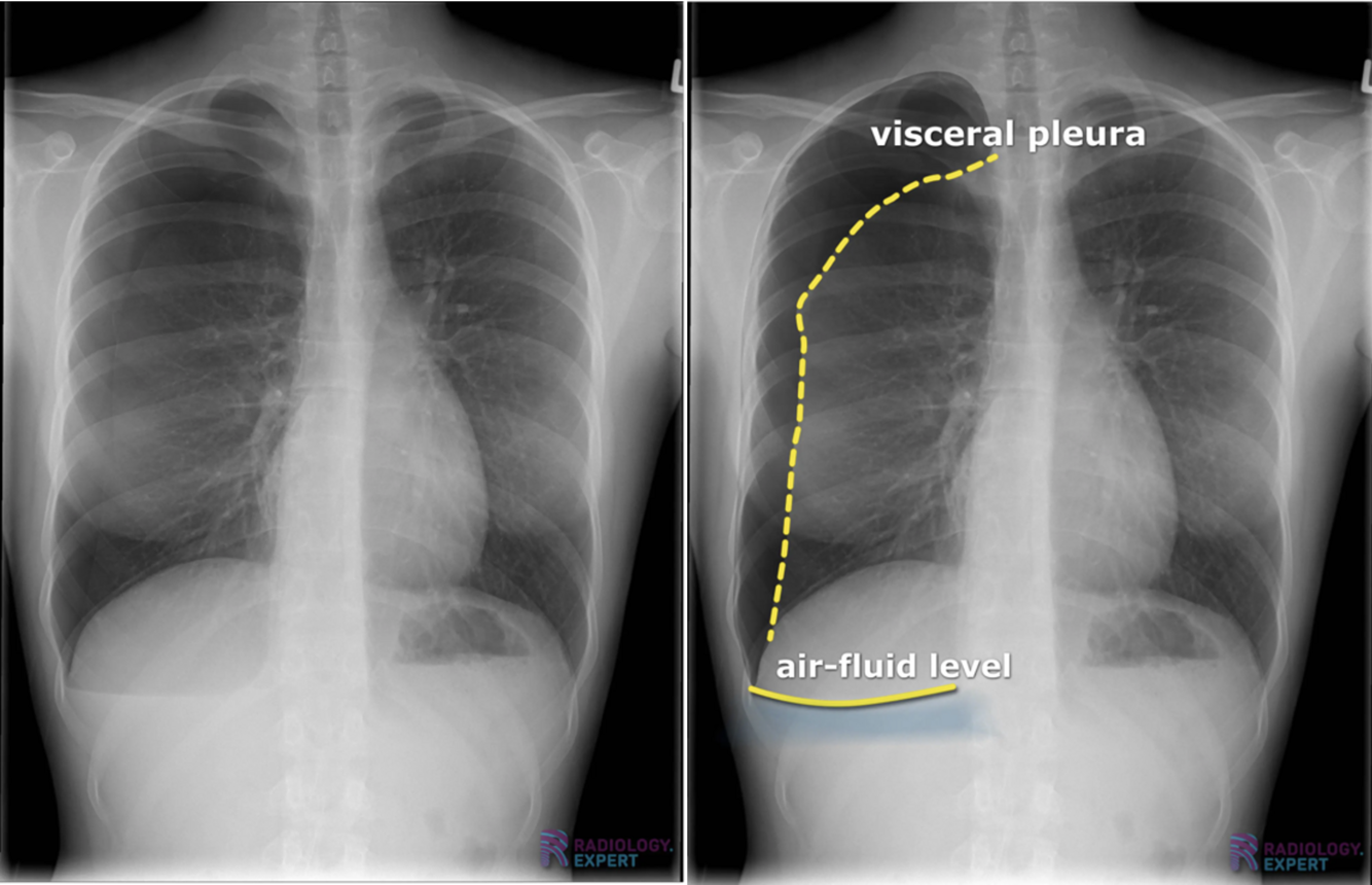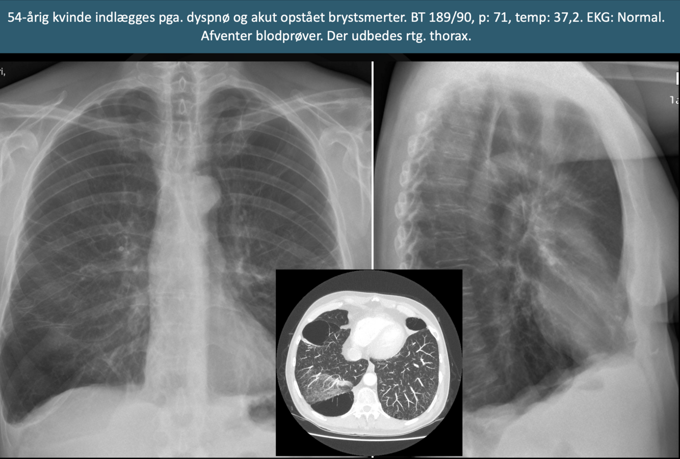 - Viser en luftlomme med en synlig visceral pleuralinie (konveks mod brystvæggen)
