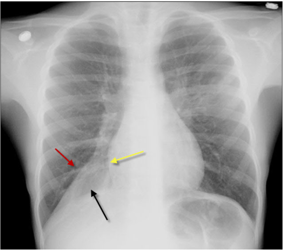 - Se efter retrokardialt mørkt rum (“den sorte trekant”) som normalt ligger centralt inferiort – (ved sløring –> obs. pneumoni, pleuraeffusion (pleuravæske))
