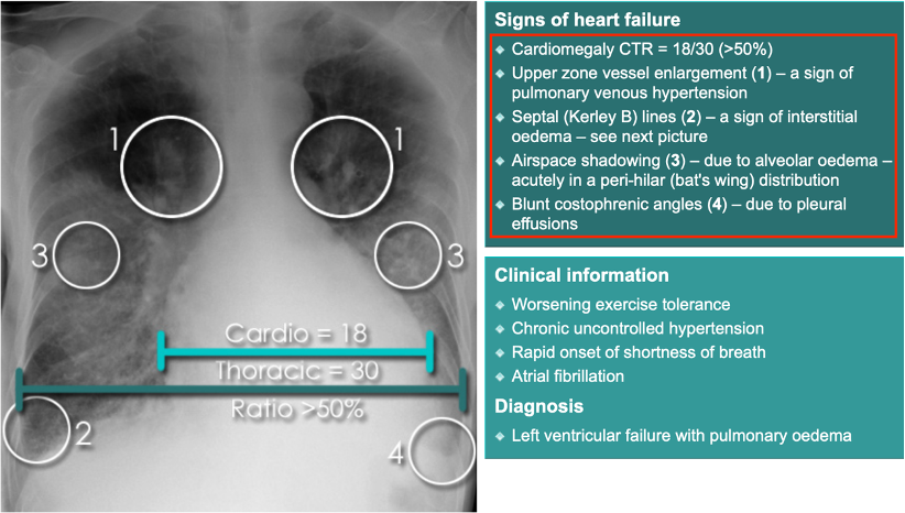 - Forstørrede, tydelige kar –> obs. lungestase (= tegn på hjertesvigt)