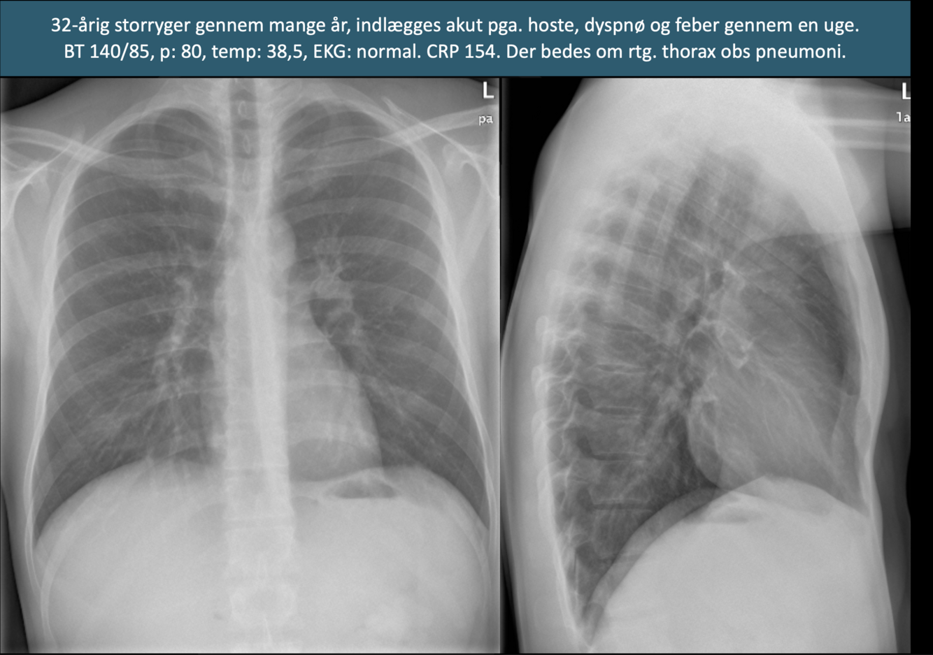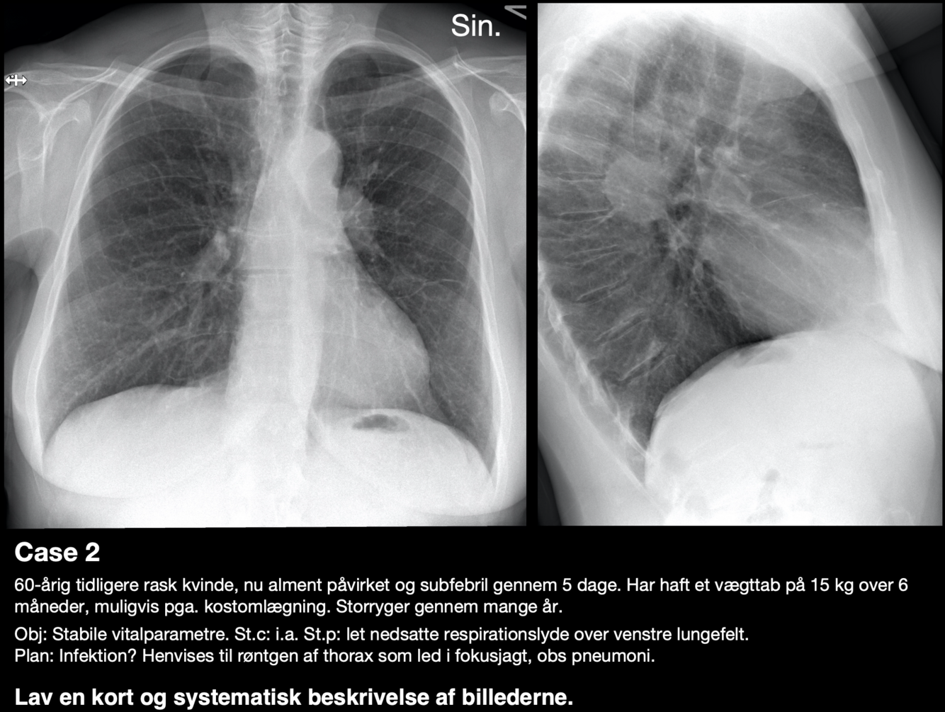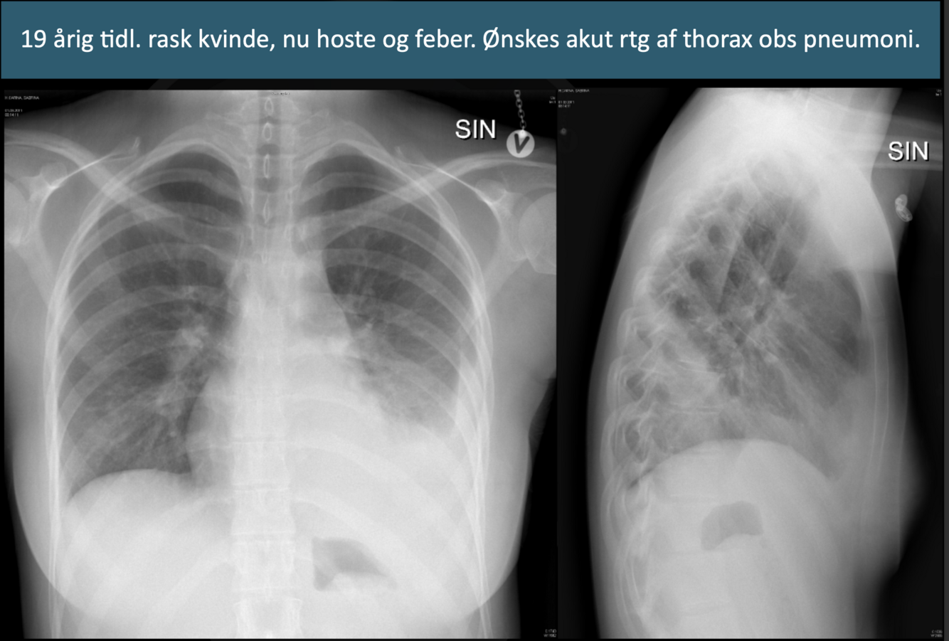 Rtg. thorax, stående i 2 plan (PA og lateral). Der er normale forhold ved hjerte og mediastinum. Der ses infiltrat basalt i venstre lungefelt, med sløring af diaphragma. Ingen pleurale forandringer. Knogler og bløddele uden patologiske forandringer. Konklusion: foreneligt med venstresidig basal pneumoni