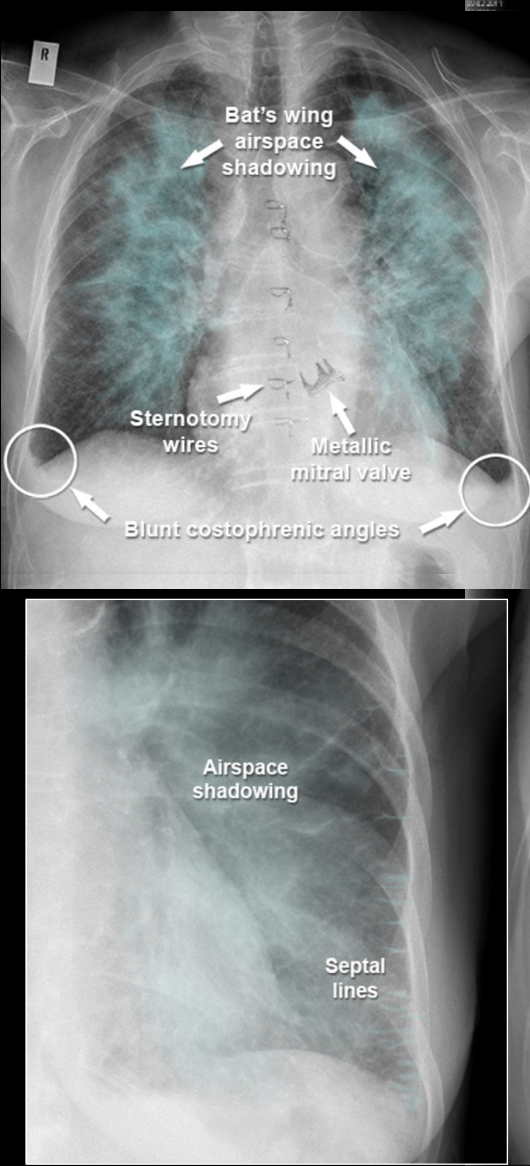* Kerley B lines (septale linjer, horisontale, aldrig længere end 2 cm, ses bedst perifert i lungerne)