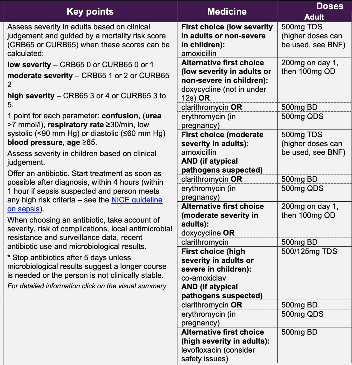 2nd line in higher severity pneumonia: Co-amoxiclav + Erythromycin/ Clarythromycin