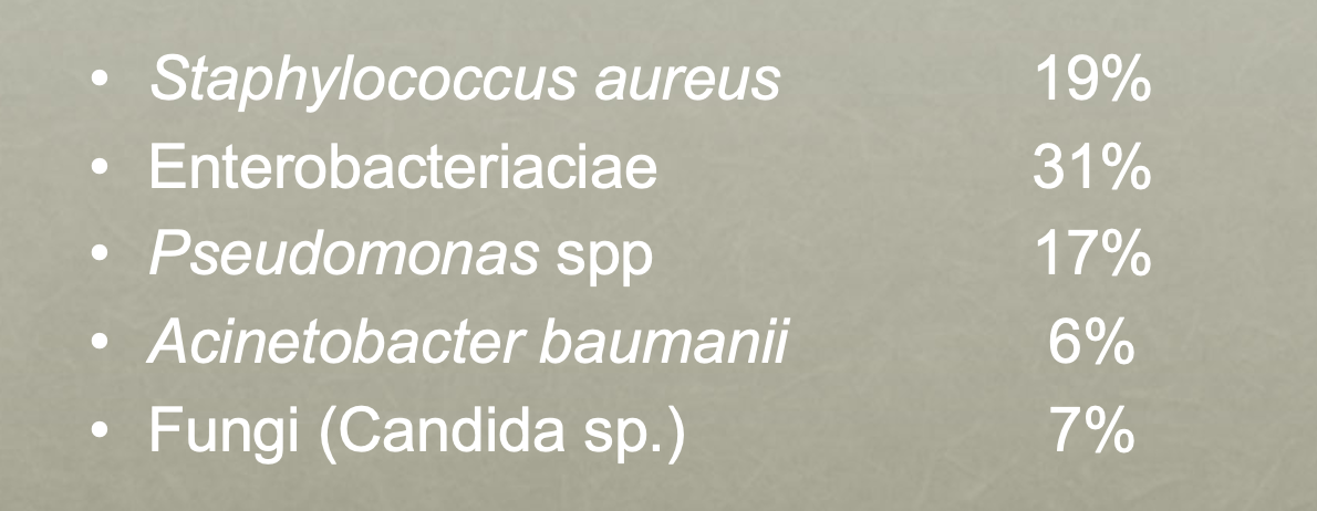 Usually Gram -ve organisms (as often gram+ve abx coverage given in hospitals)