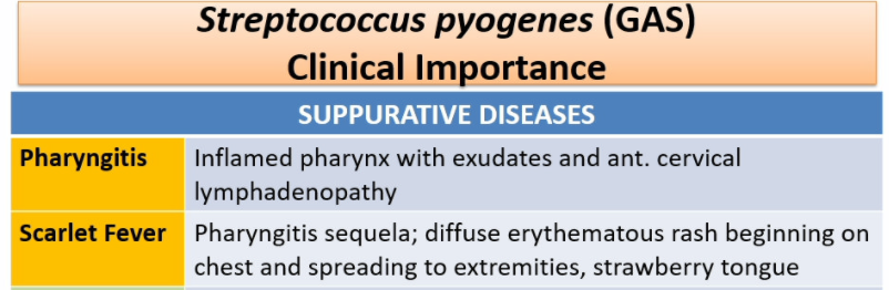 clinical syndrome: pharyngitis “strep throat”, skin infections, soft tissue infections, endocarditis