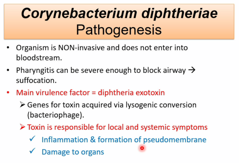 the main virulence factor for Corynebacterium diphtheriae is diphtheria exotoxin (genes for toxin acquired via lysogenic conversion → bacteriophage)