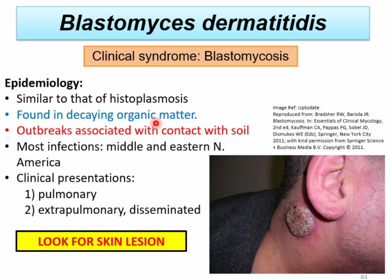 Blastomyces is found in decaying organic matter and outbreaks are associated with contact with soil