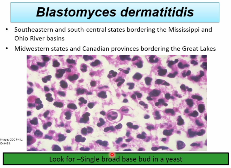 look for single broad base bud in a yeast (B = Blastomyces)