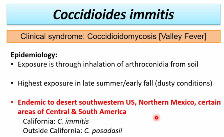 Coccidioides immitis is endemic to desert southwestern US, Nothern Mexico, certain areas of Central & South America