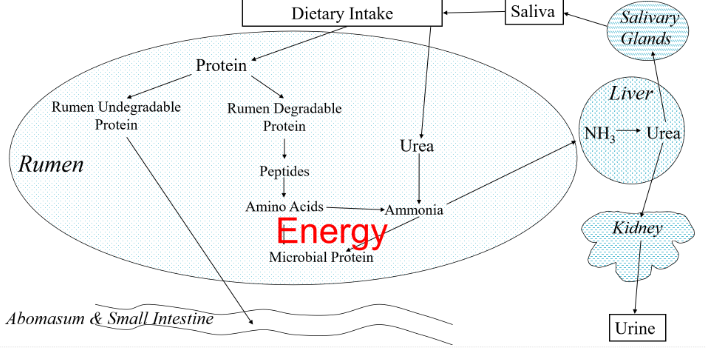 Rumen degradable protein is broken down into amino acids which is either converted to microbial protein (this uses energy) or ammonia (if no energy available)