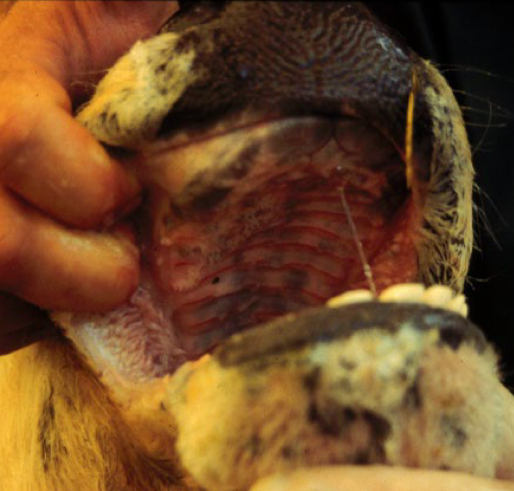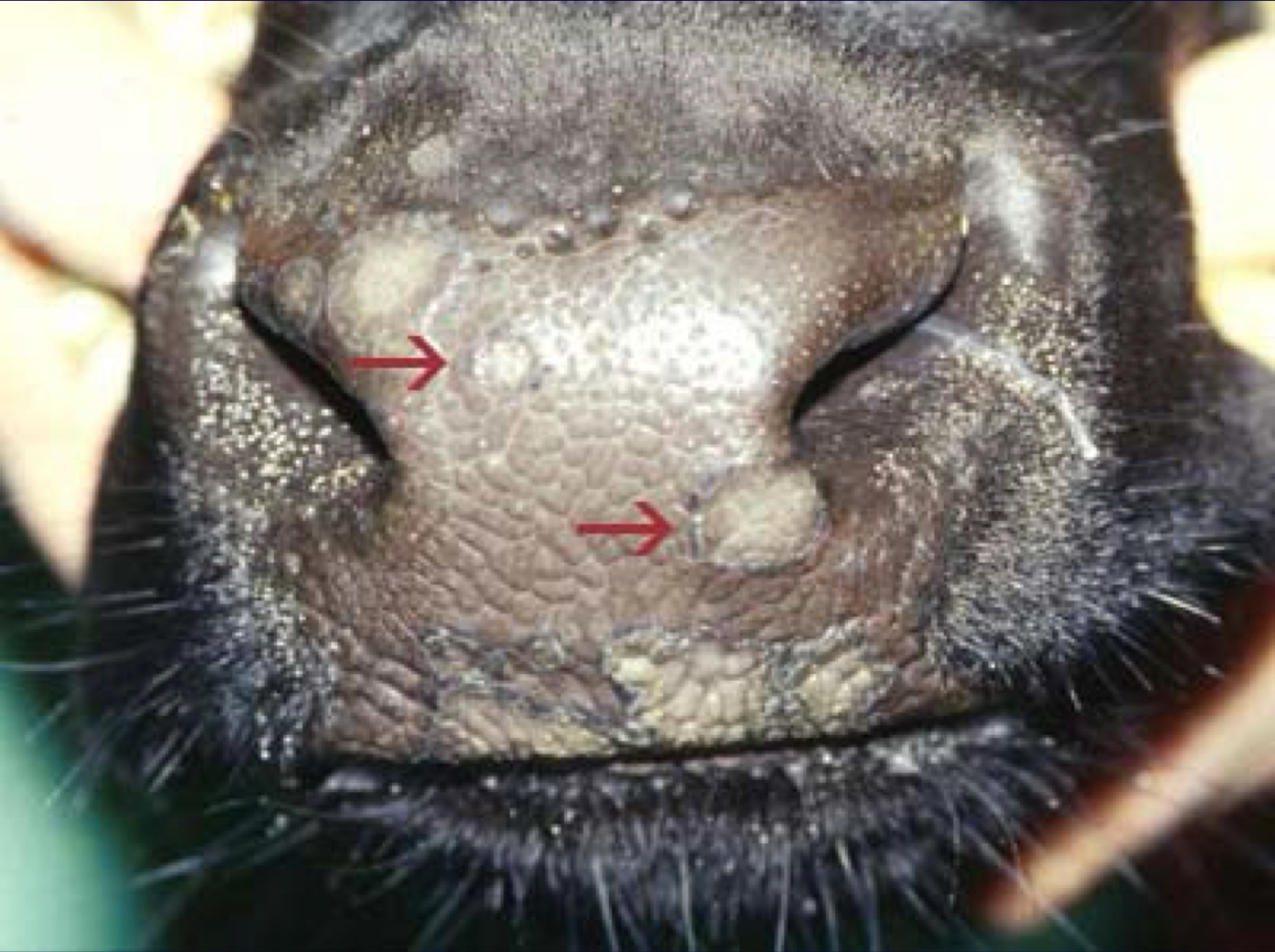 mild, incidental - raised areas on muzzle and oral mucosa –> heals as brown spots