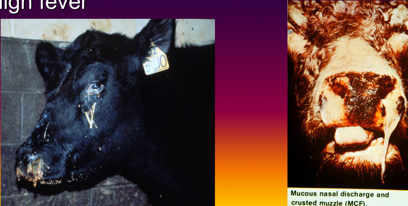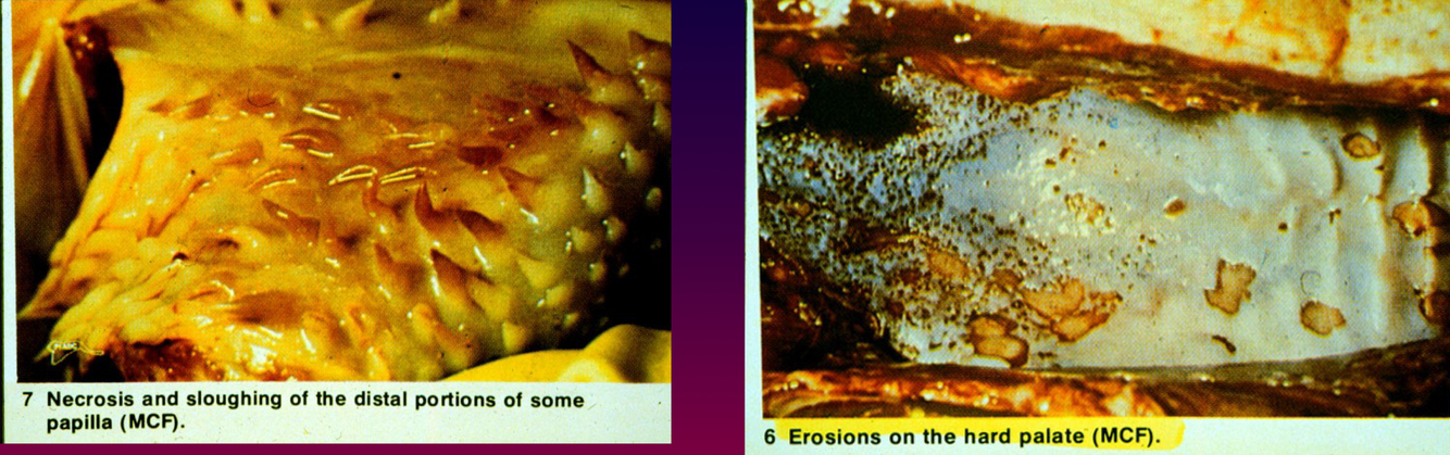 severe keratoconjunctivitis with copious mucopurulent d/c, high fever, erosion of hard palate and tongue