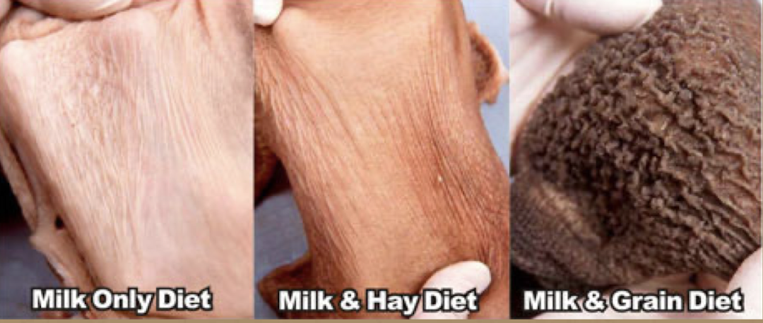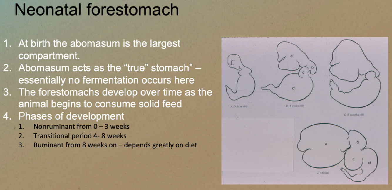 Forestomach hasn’t fully developed yet. Also, they drink milk, so no need for fermentation yet.