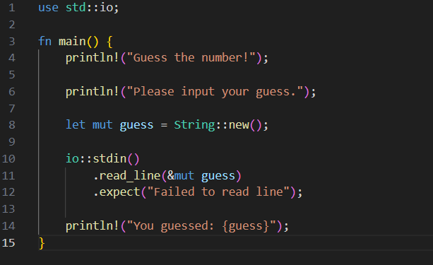 **Line 1: **Input/output library in Rust that allows us to obtain user input and print the output. io comes from rusts standard library, std